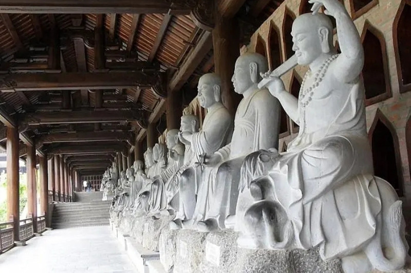 Hành lang La Hán dài nhất châu Á: Với 234 gian, chứa hơn 500 pho tượng La Hán được tạc từ đá xanh nguyên khối, thể hiện nét tinh xảo của nghệ thuật điêu khắc Việt Nam.
