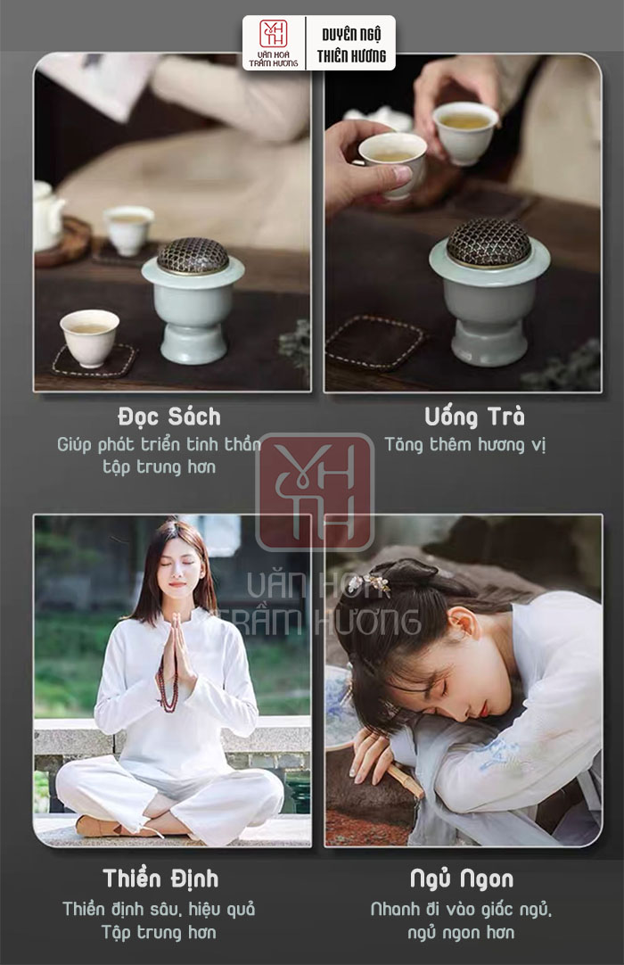 - Giảm stress, tạo không gian thư giãn: Hương trầm dịu nhẹ giúp thư giãn tâm trí, giảm căng thẳng, lo âu và hỗ trợ cải thiện giấc ngủ.