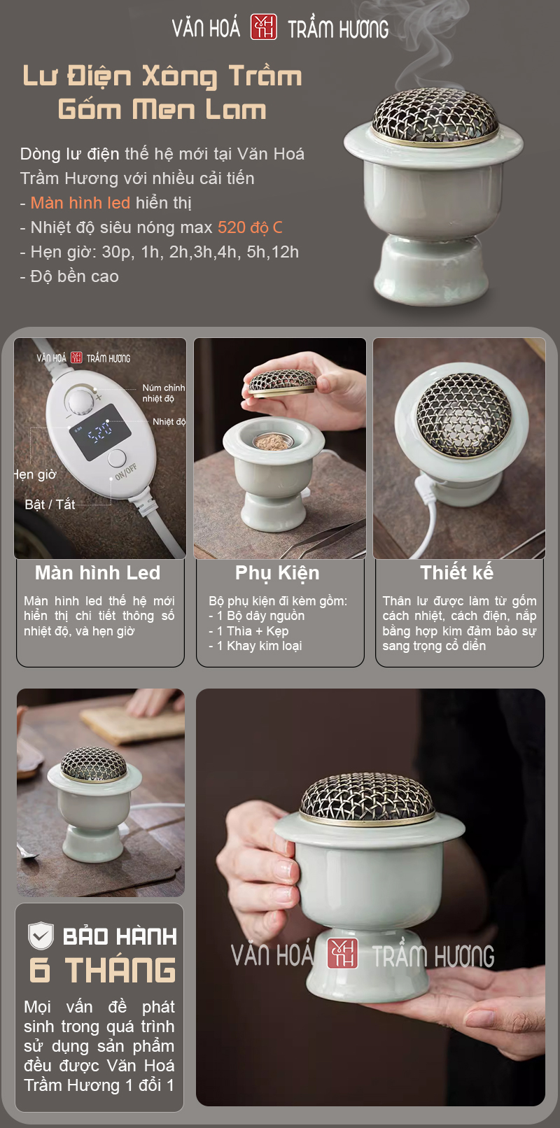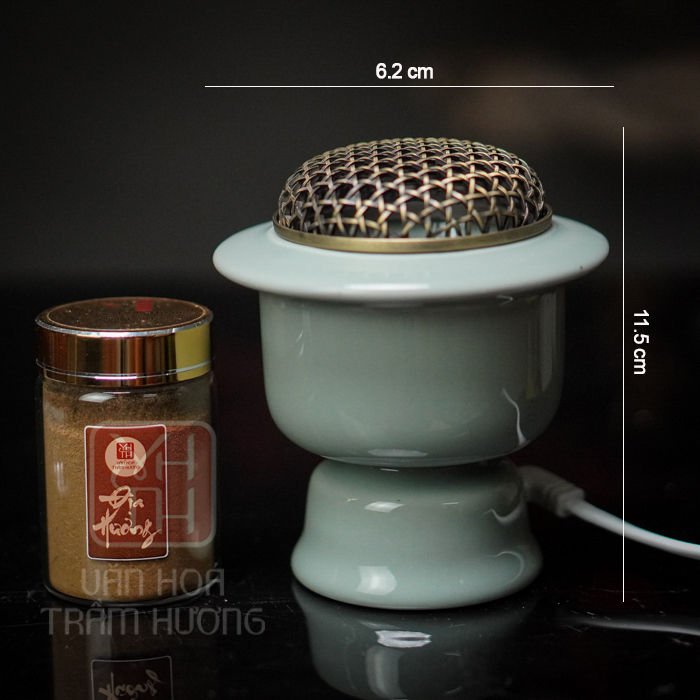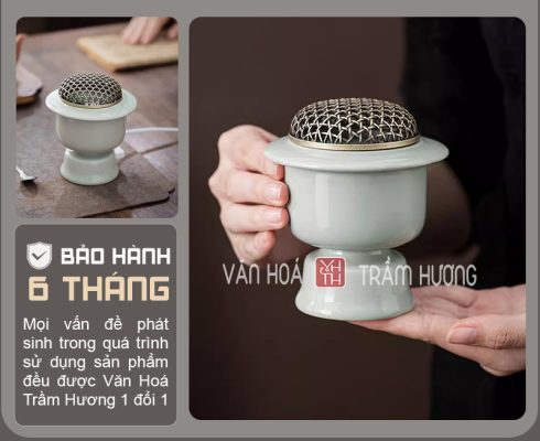 - Chất liệu và cấu tạo: Vỏ ngoài bằng gốm sứ cao cấp phủ men lam bóng mịn, chịu nhiệt tốt. Bên trong tích hợp bộ phận gia nhiệt bằng điện, giúp đốt trầm mà không cần lửa.